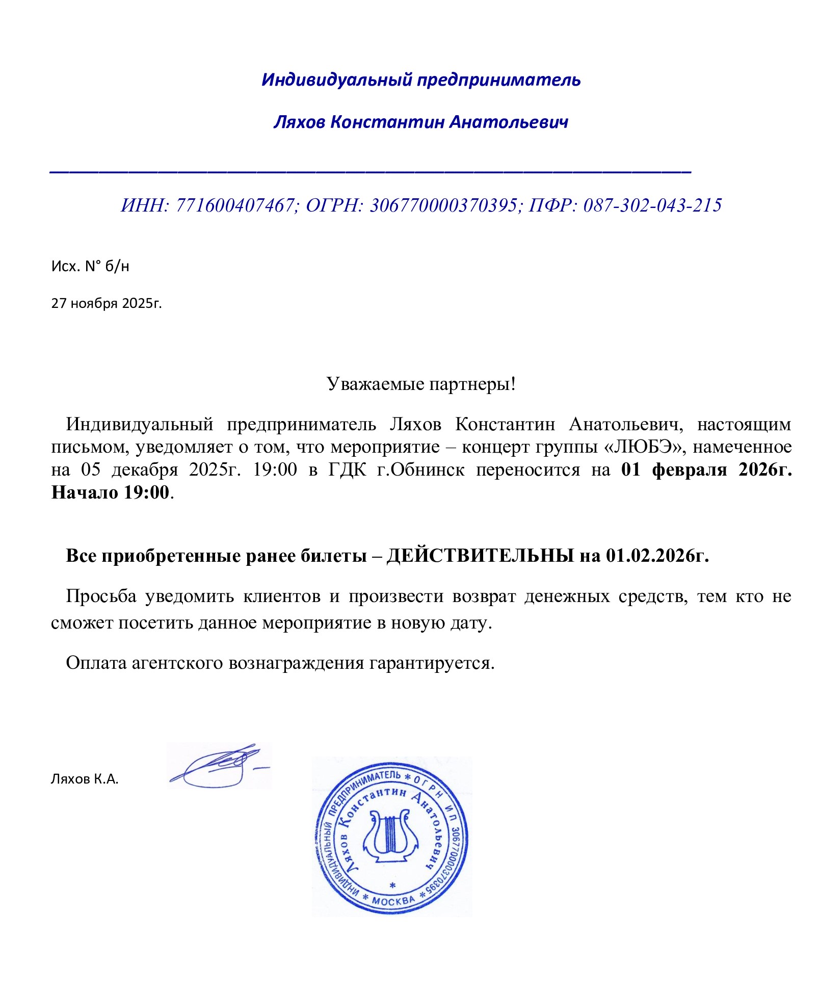 Уважаемый клиент! Спешим сообщить, что по информации, полученной от организатора, сольный концерт Ислама Итляшева с программой - ОНА ЛЮБИЛА РОЗЫ», запланированный на 20 февраля 2025 года в Липецк КРК Мегаполис, перенесен на открытую дату в связи с болезнью артиста.. Новая дата будет объявлена дополнительно. Ранее приобретенные билеты действительны на новую дату, обменивать их не нужно. Если вам не удобно посетить мероприятие в новую дату, вы можете вернуть билет по кнопке в личном кабинете во вкладке «Заказы». Деньги за электронные билеты вернутся автоматически в полном объёме на карту, с которой была произведена оплата. Если вы купили билет в кассе Ticketland.ru за наличный расчет, то обратитесь, пожалуйста, на почту: vozvrat@ticketland.ru. С уважением, команда поддержки Ticketland.