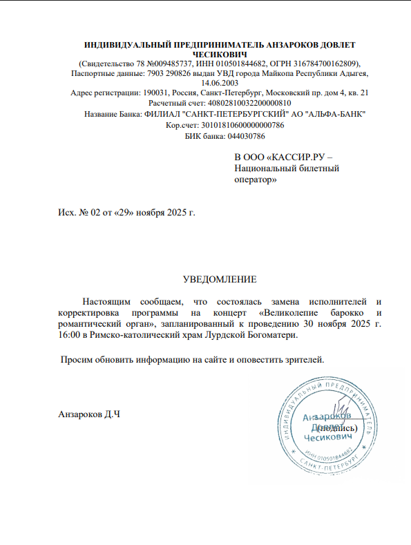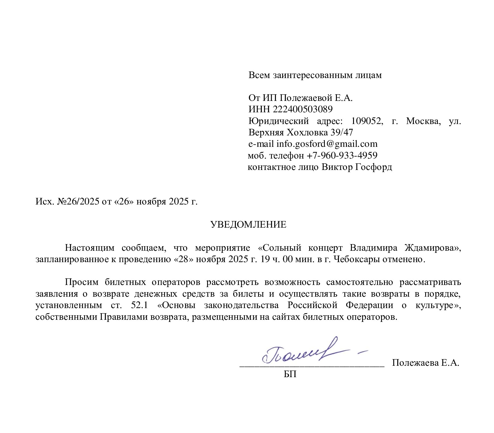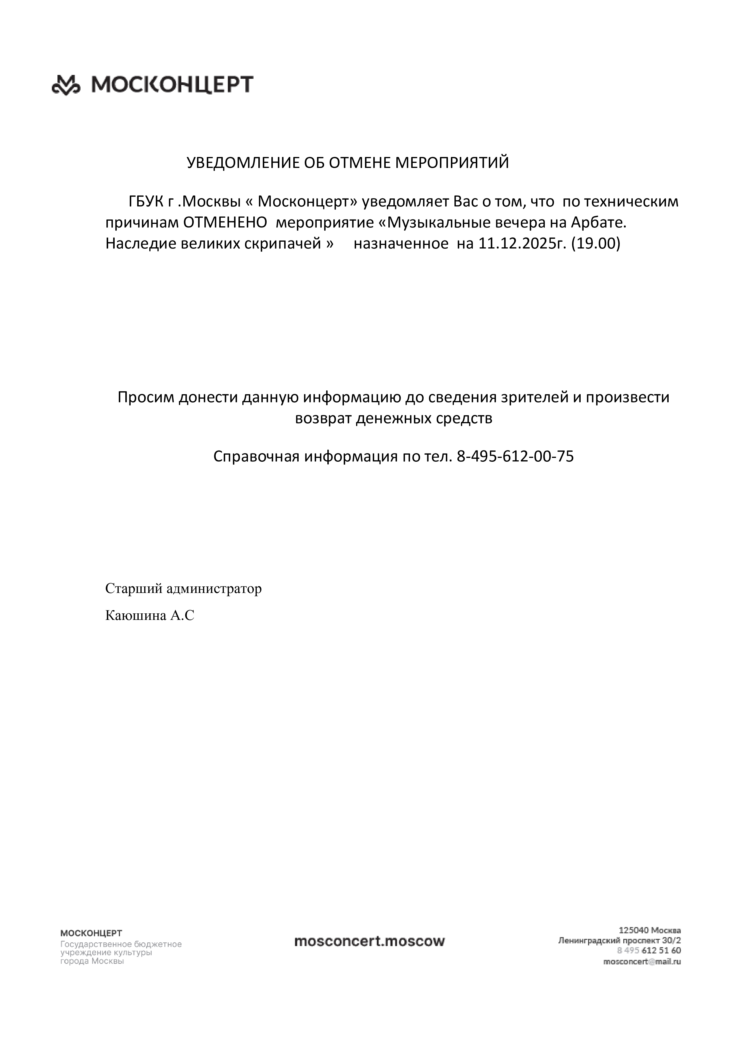 Уважаемый клиент! Спешим сообщить, что по информации, полученной от организатора, в концерте артистов АСО филармонии, аб-т №12, запланированном на 28 января 2026 года в 19:00 в малом зале Филармонии, произошли изменения в программе. Вместо Романа Черезова, Виктора Ткаченко выступят ДмитрийЛюдиновский, Дмитрий Антонюк. В концерте примет участие Илья Зузулин. Ранее приобретенные билеты действительны, обменивать их не нужно. Если вам неудобно посетить мероприятие в новую дату, вы можете вернуть билет по кнопке в личном кабинете во вкладке «Заказы». Деньги за электронные билеты вернутся автоматически в полном объёме на карту, с которой была произведена оплата. Если вы купили билет в кассе Ticketland.ru за наличный расчет, то обратитесь, пожалуйста, на почту: vozvrat@ticketland.ru. С уважением, команда поддержки Ticketland.