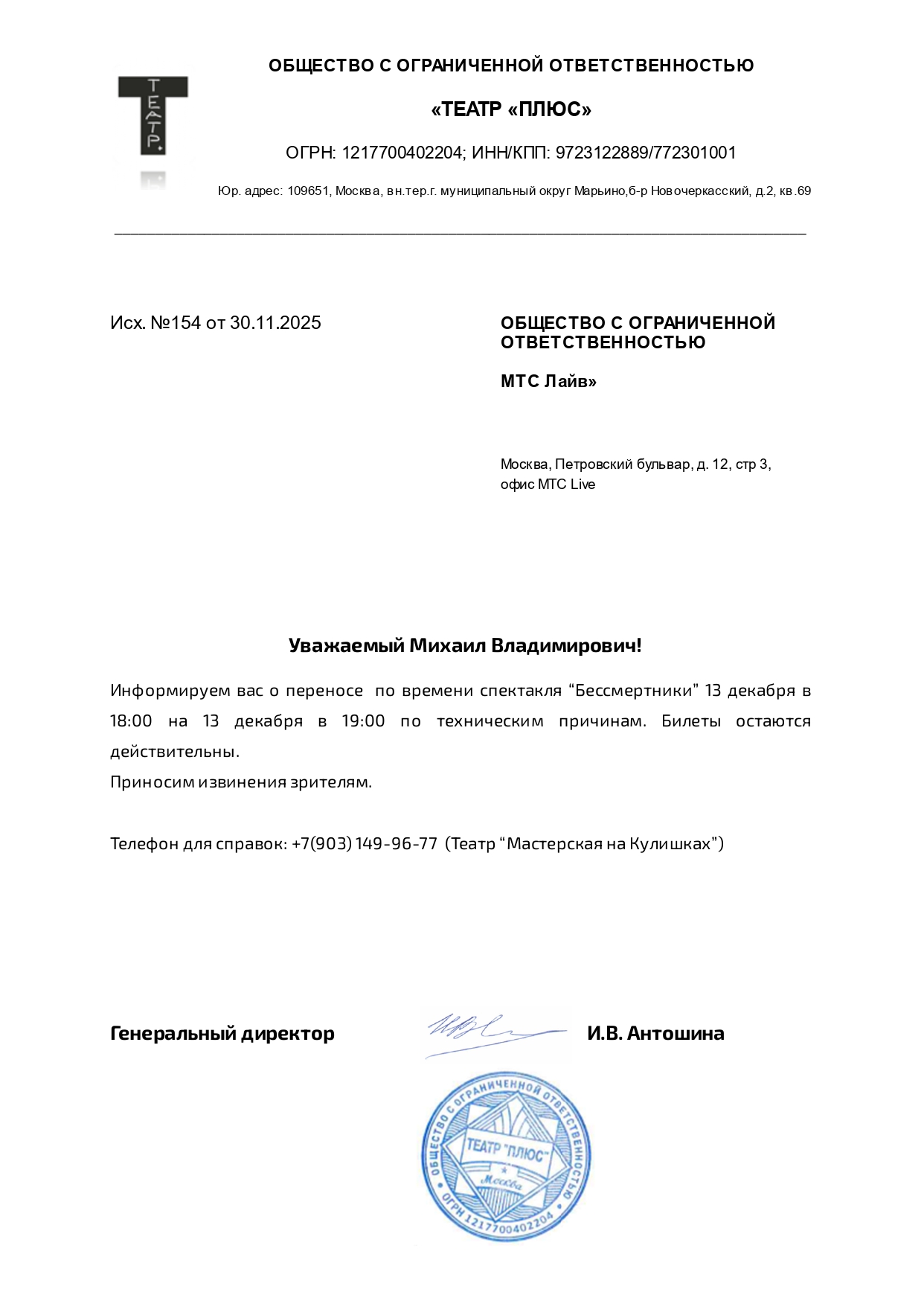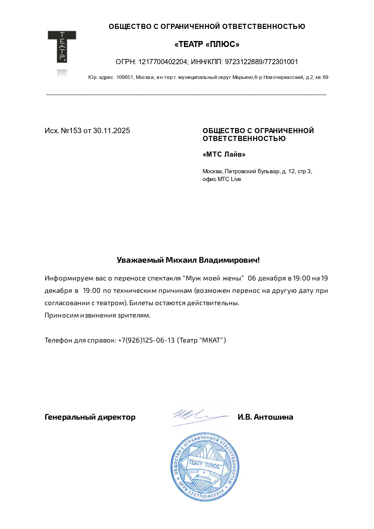 Уважаемый клиент! Спешим сообщить, что по информации, полученной от организатора, спектакль «Муж моей жены», запланированный на 6 декабря 2025 года в 19:00 в Театральном особняке, перенесен на 19 декабря 2025 года, начало в 19:00. Ранее приобретенные билеты действительны на новую дату, обменивать их не нужно. Также возможен перенос на другую дату при согласовании с театром. По всем вопросам обращайтесь, пожалуйста, к организатору спектакля по телефону: 8 (926) 125-06-13 (Театр «МКАТ»). С уважением, команда поддержки Ticketland.