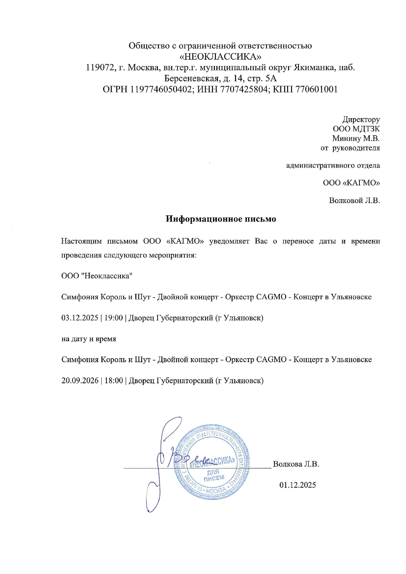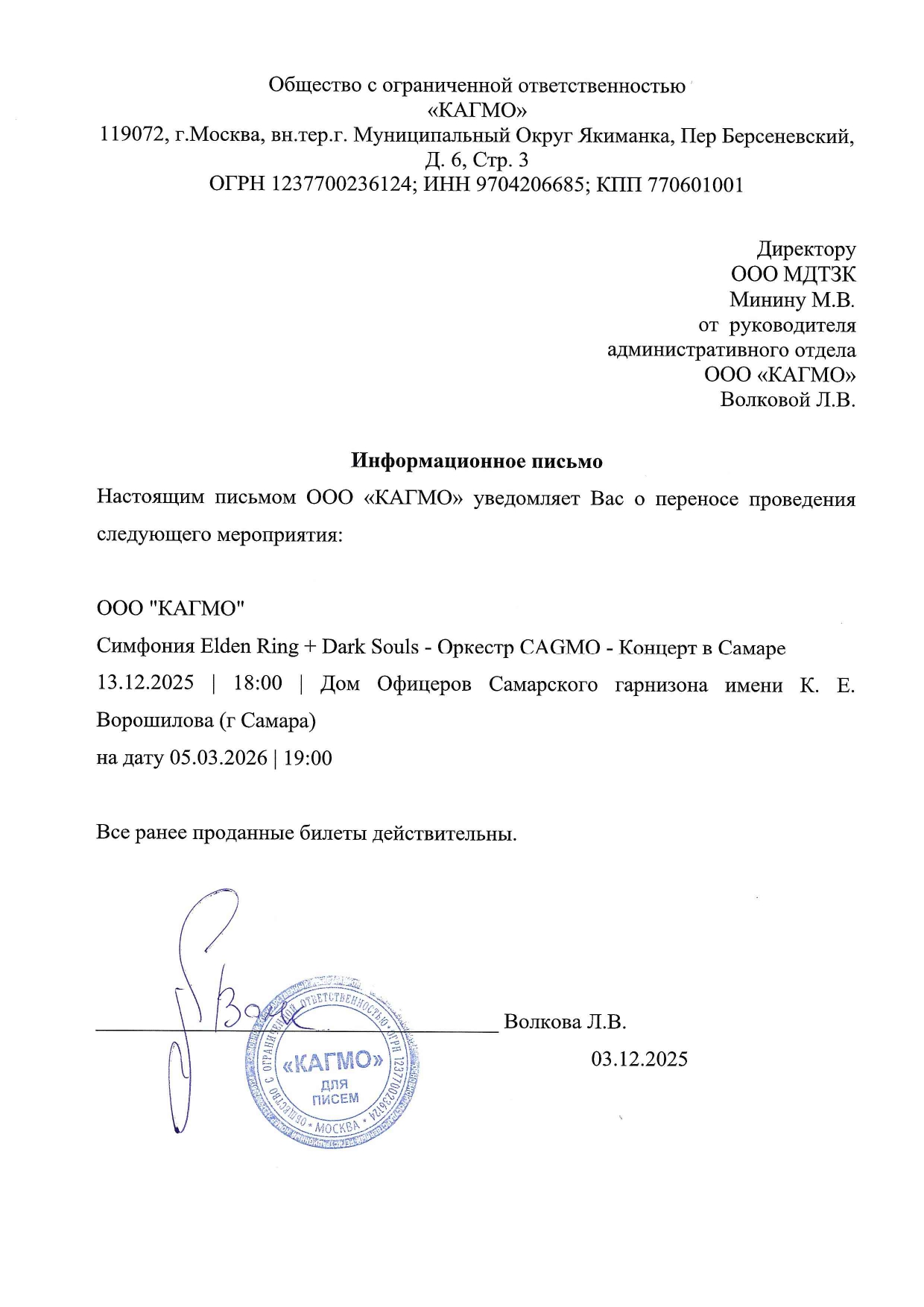 Уважаемый клиент! Спешим сообщить, что по информации, полученной от организатора, концерт оркестра оркестра «CAGMO» «Симфония Elden Ring + Dark Souls» запланированный на 13 декабря 2025 года в 18:00, в окружном Доме Офицеров, перенесён на 5 марта 2026, начало в 19:00. Ранее приобретенные билеты действительны на новую дату, обменивать их не нужно. Если вам не удобно посетить мероприятие в новую дату, вы можете вернуть билет по кнопке в личном кабинете во вкладке «Заказы». Деньги за электронные билеты вернутся автоматически в полном объёме на карту, с которой была произведена оплата. Если вы купили билет в кассе Ticketland.ru за наличный расчет, то обратитесь, пожалуйста, на почту: vozvrat@ticketland.ru. С уважением, команда поддержки Ticketland