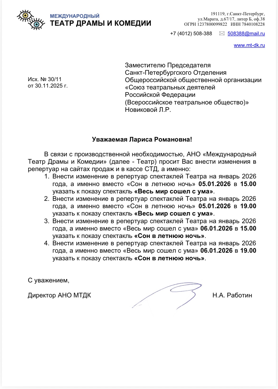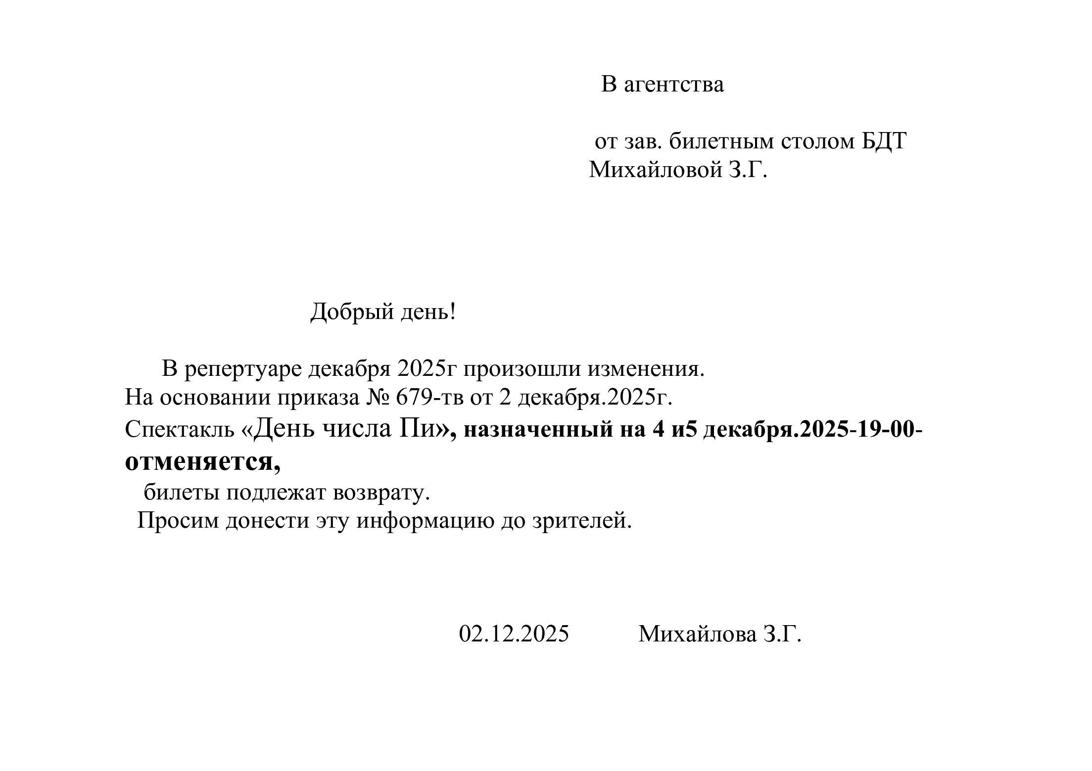 Уважаемый клиент! Спешим сообщить, что по информации, полученной от организатора, спектакль «Васса (Мать)», запланированный на 4 декабря 2025 года в театре на Фонтанке, заменяется на спектакль «Школа налогоплательщиков». Ранее приобретенные билеты действительны на новый спектакль, обменивать их не нужно. Если вы не хотите посетить новое мероприятие, вы можете вернуть билет по кнопке в личном кабинете во вкладке «Заказы» (до 04.12.25 до 19.00). Деньги за электронные билеты вернутся автоматически в полном объёме на карту, с которой была произведена оплата. Если вы купили билет в кассе Ticketland.ru за наличный расчет, то обратитесь, пожалуйста, на почту: vozvrat@ticketland.ru. С уважением, команда поддержки Ticketland