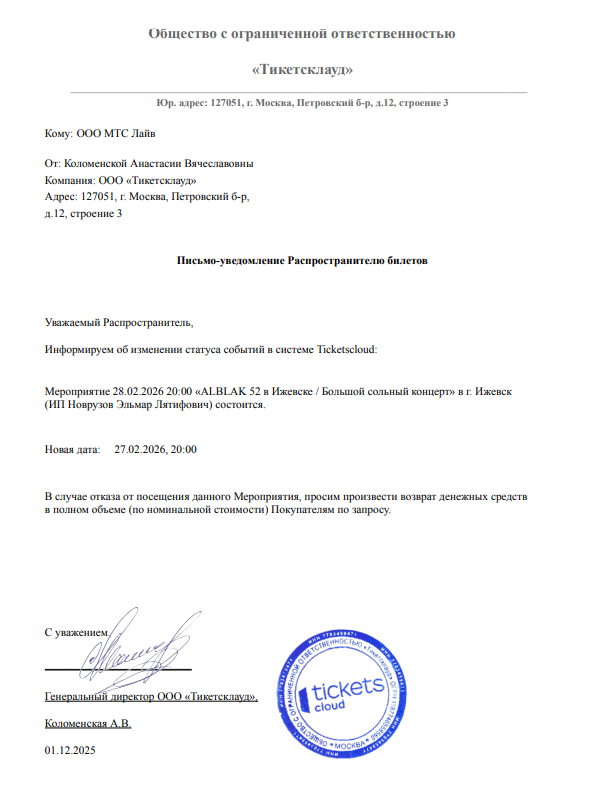 Уважаемый клиент! Спешим сообщить, что по информации, полученной от организатора, концерт ALBLAK 52, запланированный на 28.02.2026 вNobel concert hall, переносится на 27.02.2026 в 20:00 в Nobel concert hall. Ранее приобретенные билеты действительны новую дату, обменивать их не нужно. Если вам неудобно посетить мероприятие в новую дату, вы можете вернуть билет по кнопке в личном кабинете во вкладке «Заказы». Деньги за электронные билеты вернутся автоматически в полном объёме на карту, с которой была произведена оплата. Если вы купили билет в кассе Ticketland.ru за наличный расчет, то обратитесь, пожалуйста, на почту: vozvrat@ticketland.ru. С уважением, команда поддержки Ticketland