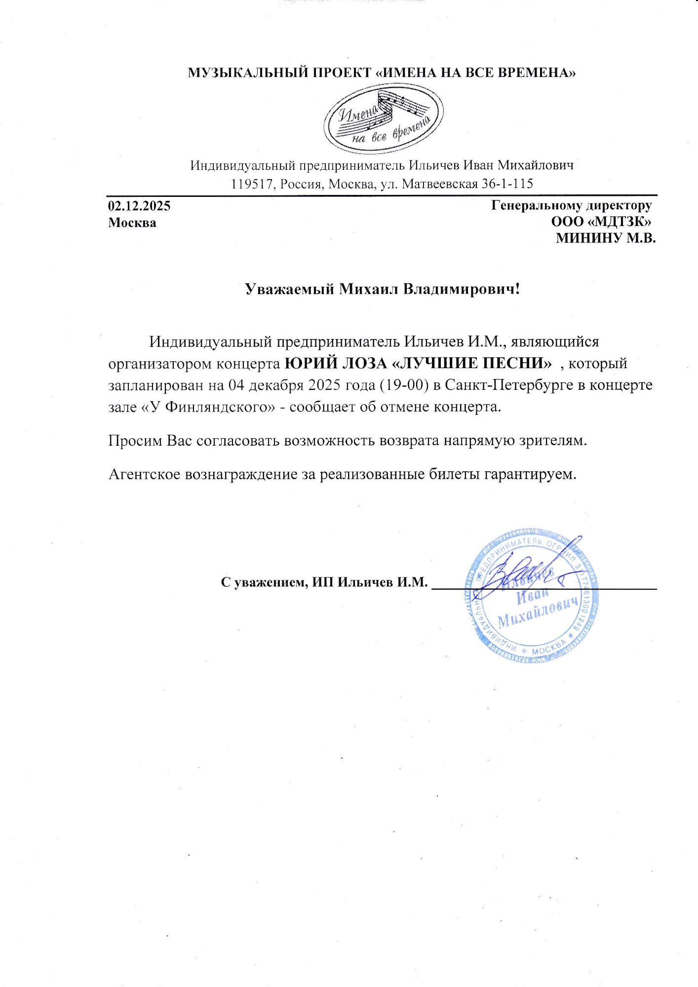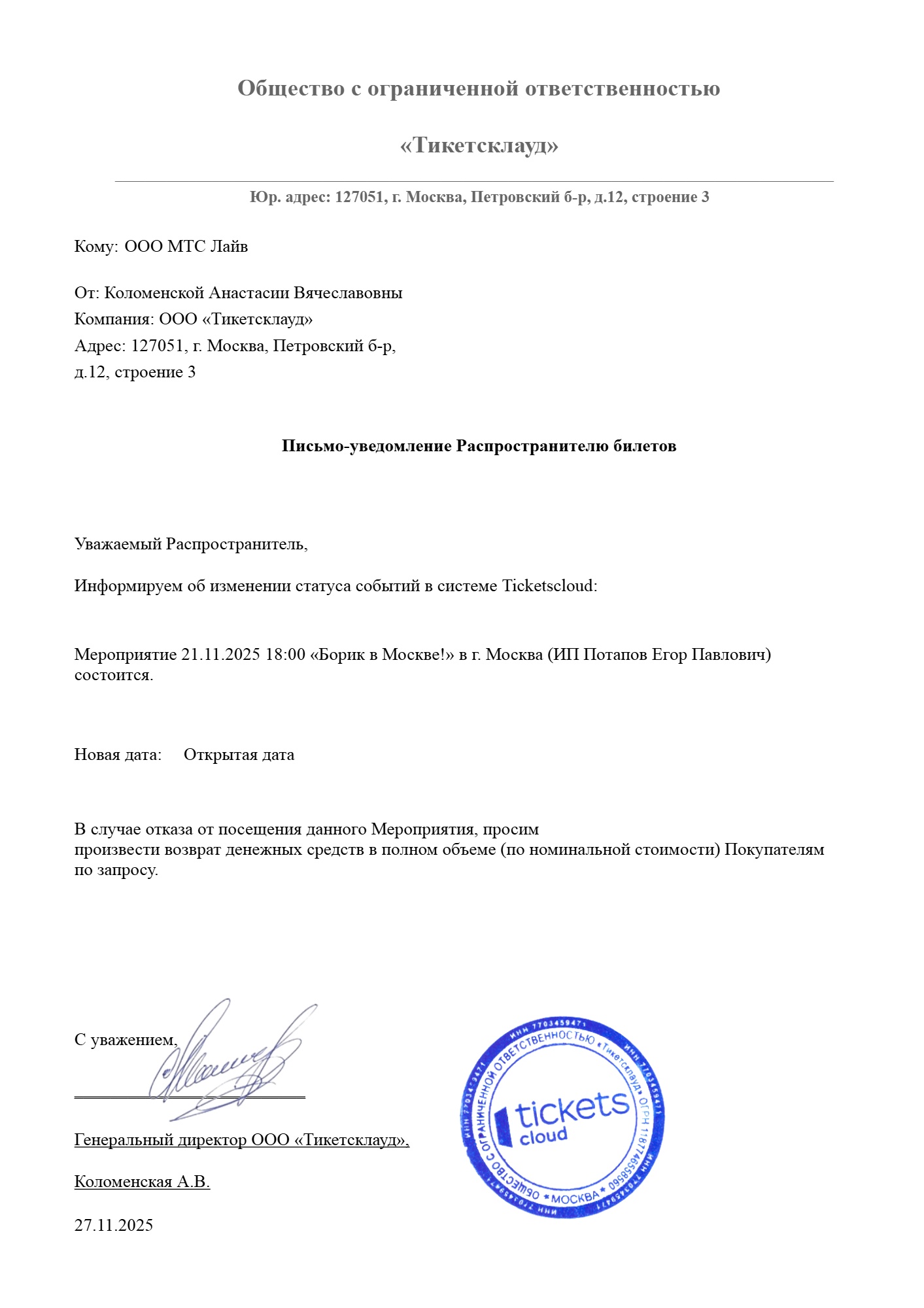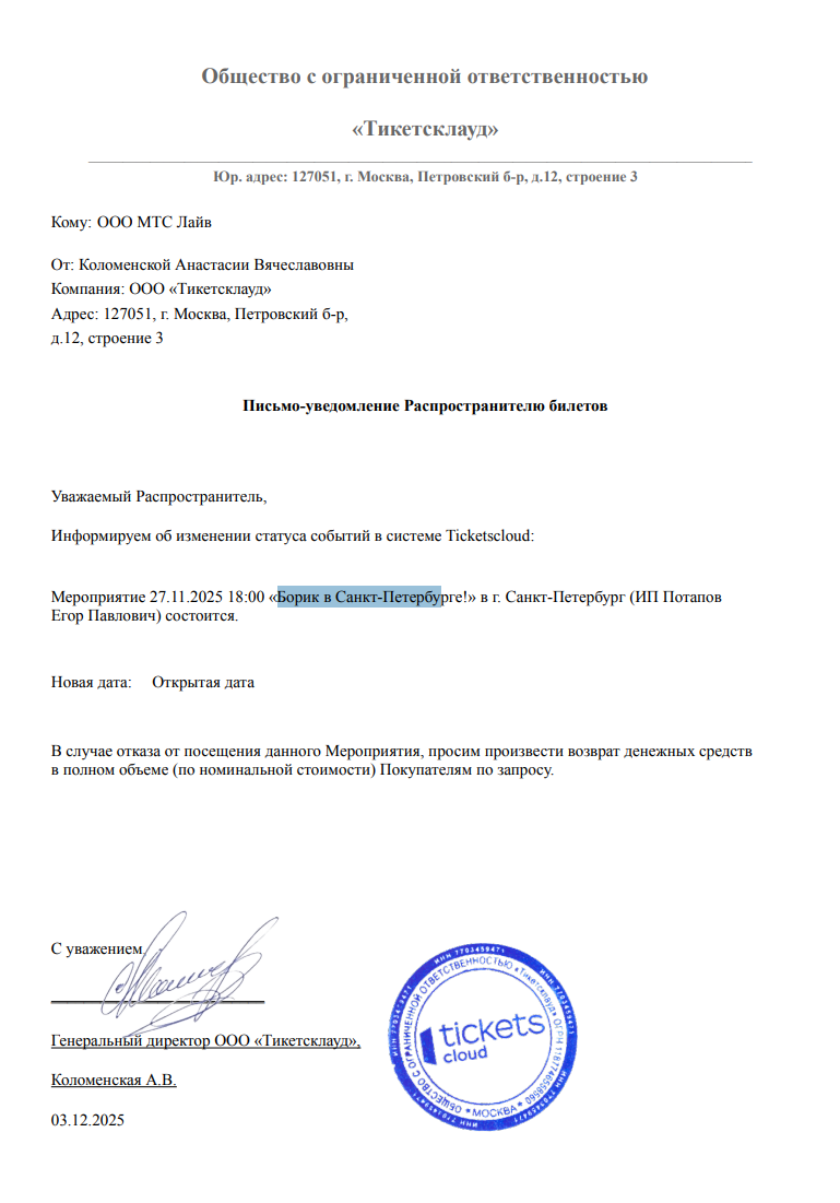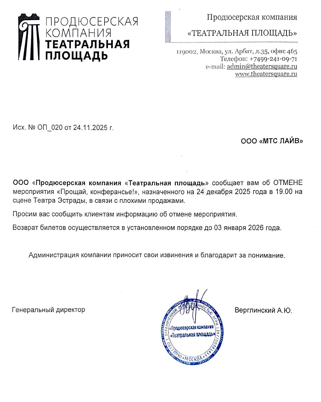 Уважаемый клиент! Спешим сообщить, что по информации, полученной от организатора, шоу «Музыкальное лото со стендап-комиком», запланированное на 2025-12-28 в 19:00 в Руки Вверх! Бар Таганка, отменено. Организатор предлагает посетить мероприятие в любую другую дату. Для того, чтобы подтвердить перенос, нужно связаться с организатором и подтвердить свое присутствие способом звонка или сообщения тел. +7 (926) 851-85-89. тг - @standupmoskvich. Это очень важно, потому что мест может не быть тех, которые изначально приобретались. Возможно места будут отличаться по цене, поэтому разница в стоимости будет возвращена на карту.Без подтверждения организатор не гарантирует наличие свободных мест. Если новые условия вас не устраивают, вы можете вернуть билет по кнопке в личном кабинете во вкладке «Заказы». Деньги за электронные билеты вернутся автоматически в полном объёме на карту, с которой была произведена оплата. Если вы купили билет в кассе Ticketland.ru за наличный расчет, то обратитесь, пожалуйста, на почту: vozvrat@ticketland.ru. С уважением, команда поддержки Ticketland.
