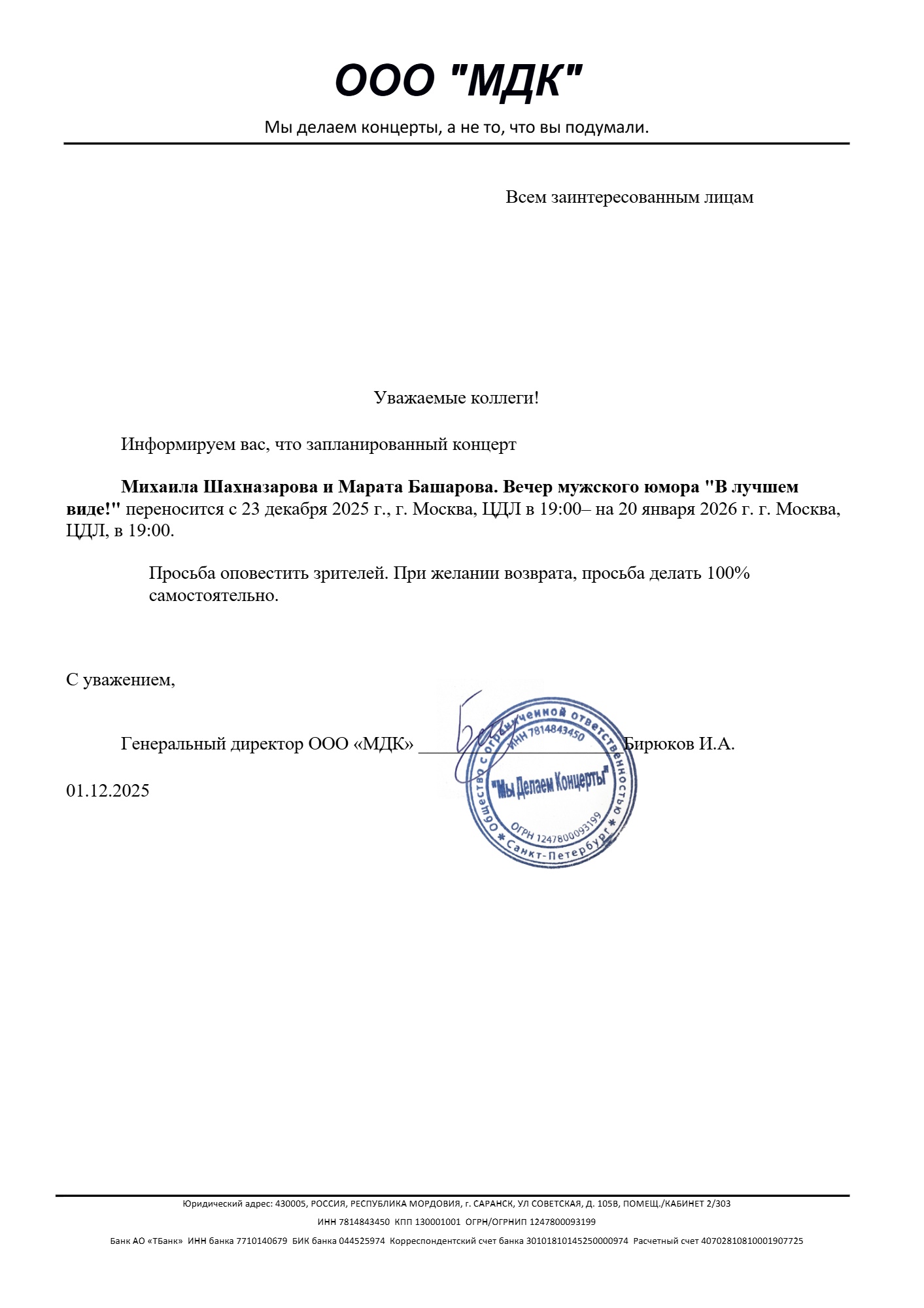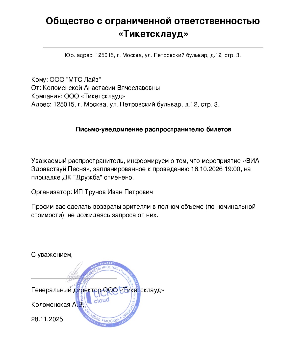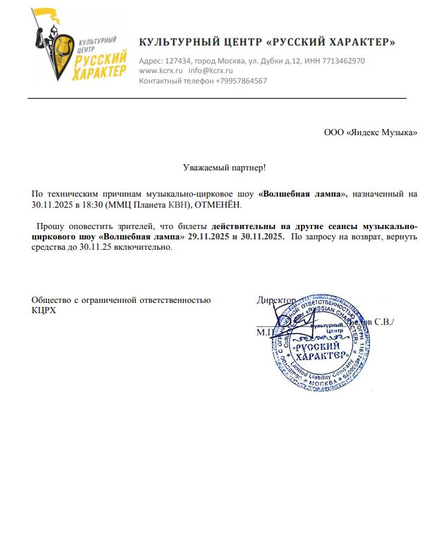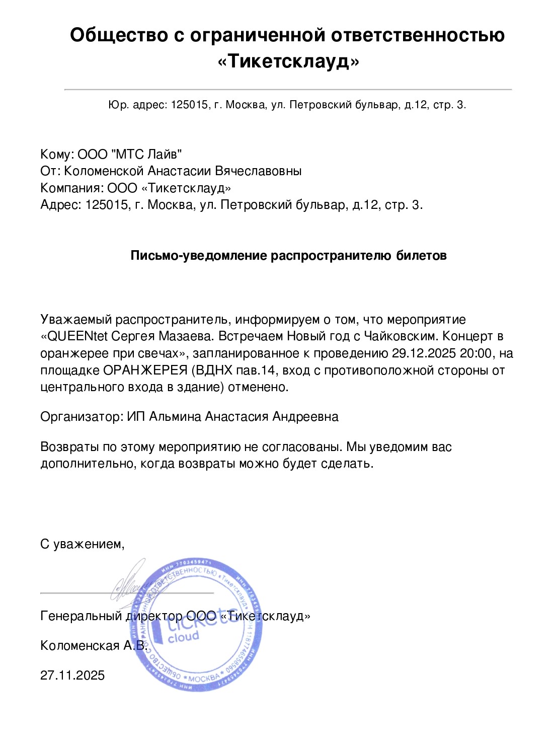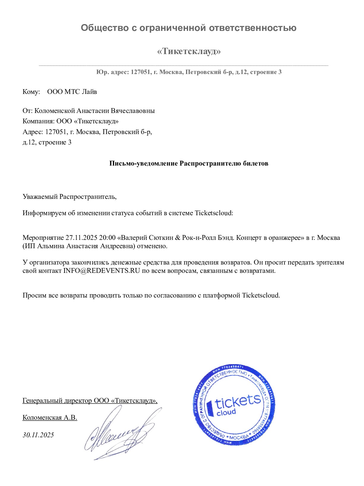 Уважаемый клиент! Спешим сообщить, что по информации, полученной от организатора, шоу «Музыкальное лото со стендап-комиком», запланированное на 2025-12-28 в 19:00 в Руки Вверх! Бар Таганка, отменено. Организатор предлагает посетить мероприятие в любую другую дату. Для того, чтобы подтвердить перенос, нужно связаться с организатором и подтвердить свое присутствие способом звонка или сообщения тел. +7 (926) 851-85-89. тг - @standupmoskvich. Это очень важно, потому что мест может не быть тех, которые изначально приобретались. Возможно места будут отличаться по цене, поэтому разница в стоимости будет возвращена на карту.Без подтверждения организатор не гарантирует наличие свободных мест. Если новые условия вас не устраивают, вы можете вернуть билет по кнопке в личном кабинете во вкладке «Заказы». Деньги за электронные билеты вернутся автоматически в полном объёме на карту, с которой была произведена оплата. Если вы купили билет в кассе Ticketland.ru за наличный расчет, то обратитесь, пожалуйста, на почту: vozvrat@ticketland.ru. С уважением, команда поддержки Ticketland.