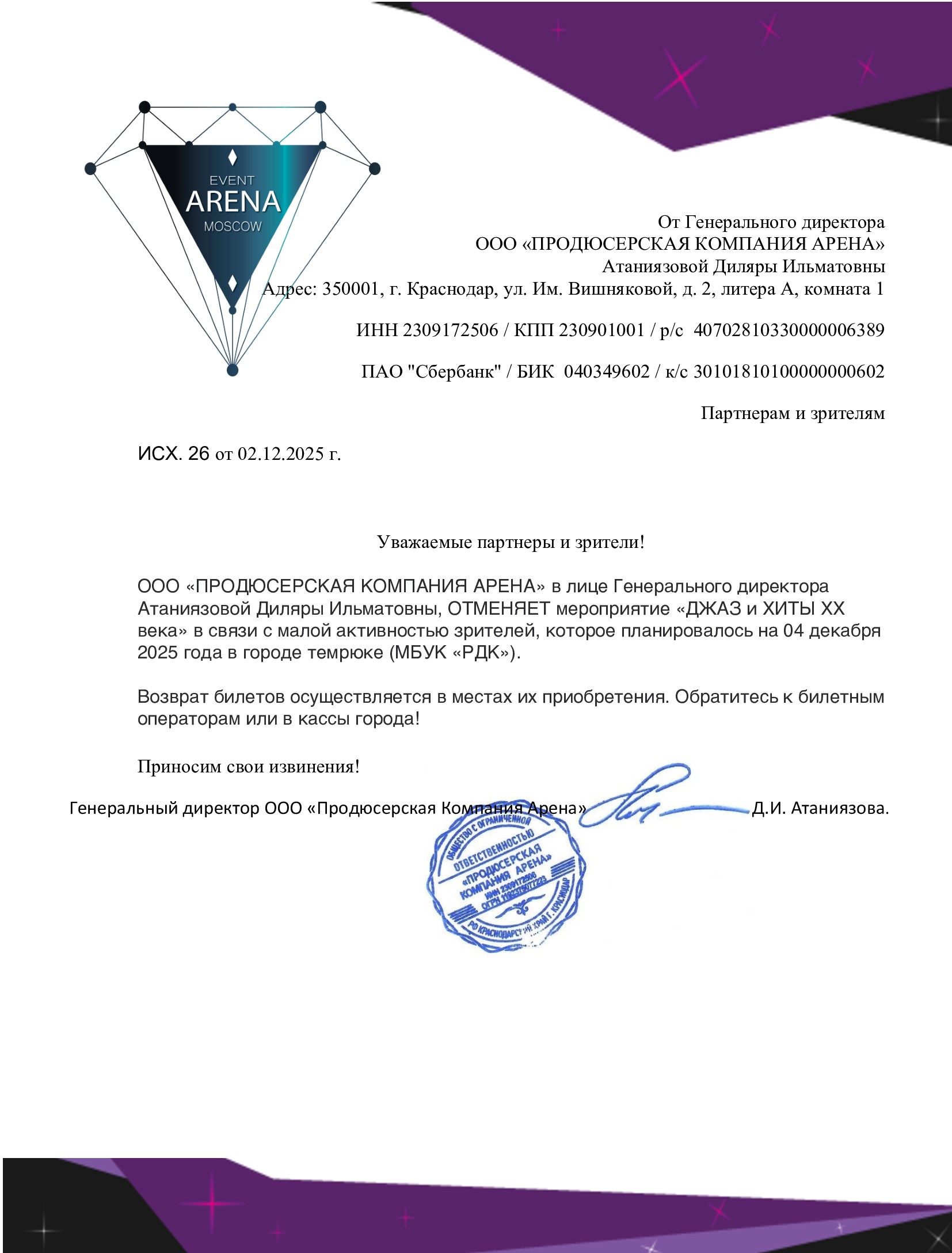 Уважаемый клиент! Спешим сообщить, что по информации, полученной от организатора, концерт «Джаз с новогодним настроением», запланированный на 6 декабря 2025 года в 17:00 в Хабаровской краевой филармонии, перенесён на 31 января 2026 года, начало в 17:00. Ранее приобретенные билеты действительны на новую дату, обменивать их не нужно. Если вам неудобно посетить концерт в новую дату, вы можете вернуть билет по кнопке в личном кабинете во вкладке «Заказы» (до 14 декабря 2025 года включительно). Деньги за электронные билеты вернутся автоматически в полном объёме на карту, с которой была произведена оплата. Если вы купили билет в кассе Ticketland.ru за наличный расчет, то обратитесь, пожалуйста, на почту: vozvrat@ticketland.ru. С уважением, команда поддержки Ticketland.