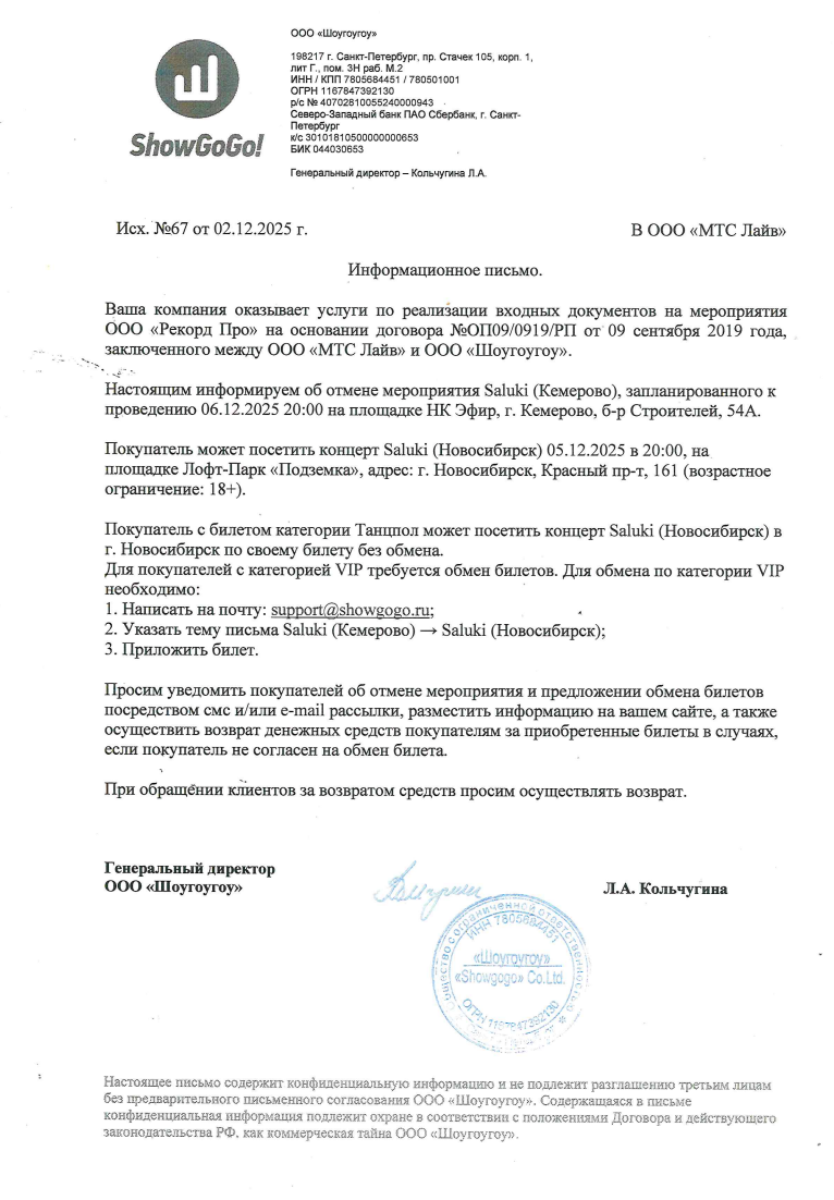Уважаемый клиент! Спешим сообщить, что по информации, полученной от организатора, концерт «Saluki», запланированный на 06 декабря 2025 года в клубе «Эфир», отменён. Организатор предлагает посетить концерт в г. Новосибирск, 05.12.2025 20:00, на площадке Лофт-Парк «Подземка», адрес: г. Новосибирск, Красный пр-т, 161 (возрастное ограничение: 18+). Для категории билетов Танцпол обмен билета не требуется. Для категории билета VIP требуется обмен. Для обмена по категории VIP необходимо: 1. Написать на почту: support@showgogo.ru; 2. Указать тему письма Saluki (Кемерово) > Saluki (Новосибирск); 3. Приложить билет. Заявки принимаются до 04.12.2025 10:00. Обращаем внимание, если произвели обмен билетов, возврат денежных средств не производится. Если вам не удобно посетить мероприятие, вы можете вернуть билет по кнопке в личном кабинете во вкладке «Заказы». Деньги за электронные билеты вернутся автоматически в полном объёме на карту, с которой была произведена оплата. Если вы купили билет в кассе Ticketland.ru за наличный расчет, то обратитесь, пожалуйста, на почту: vozvrat@ticketland.ru. С уважением, команда поддержки Ticketland.