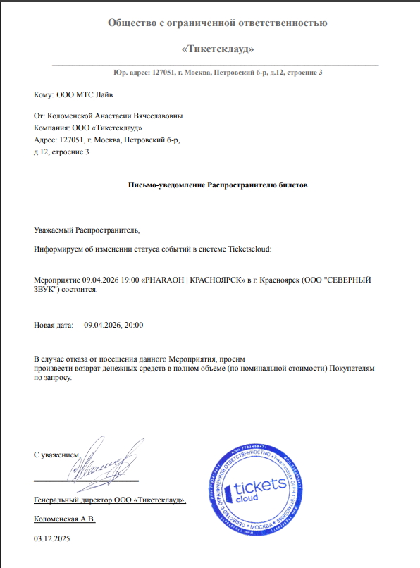 Уважаемый клиент! Спешим сообщить, что по информации, полученной от организатора, концерт Pharaoh, запланированный на 09.04.2026 в 19:00 вГранд Холле Сибирь, переносится на 09.04.2026 в 20:00. Площадка не меняется. Ранее приобретенные билеты действительны на новое время, обменивать их не нужно. Если вам не удобно посетить мероприятие, вы можете вернуть билет по кнопке в личном кабинете во вкладке «Заказы». Деньги за электронные билеты вернутся автоматически в полном объёме на карту, с которой была произведена оплата. Если вы купили билет в кассе Ticketland.ru за наличный расчет, то обратитесь, пожалуйста, на почту: vozvrat@ticketland.ru. С уважением, команда поддержки Ticketland