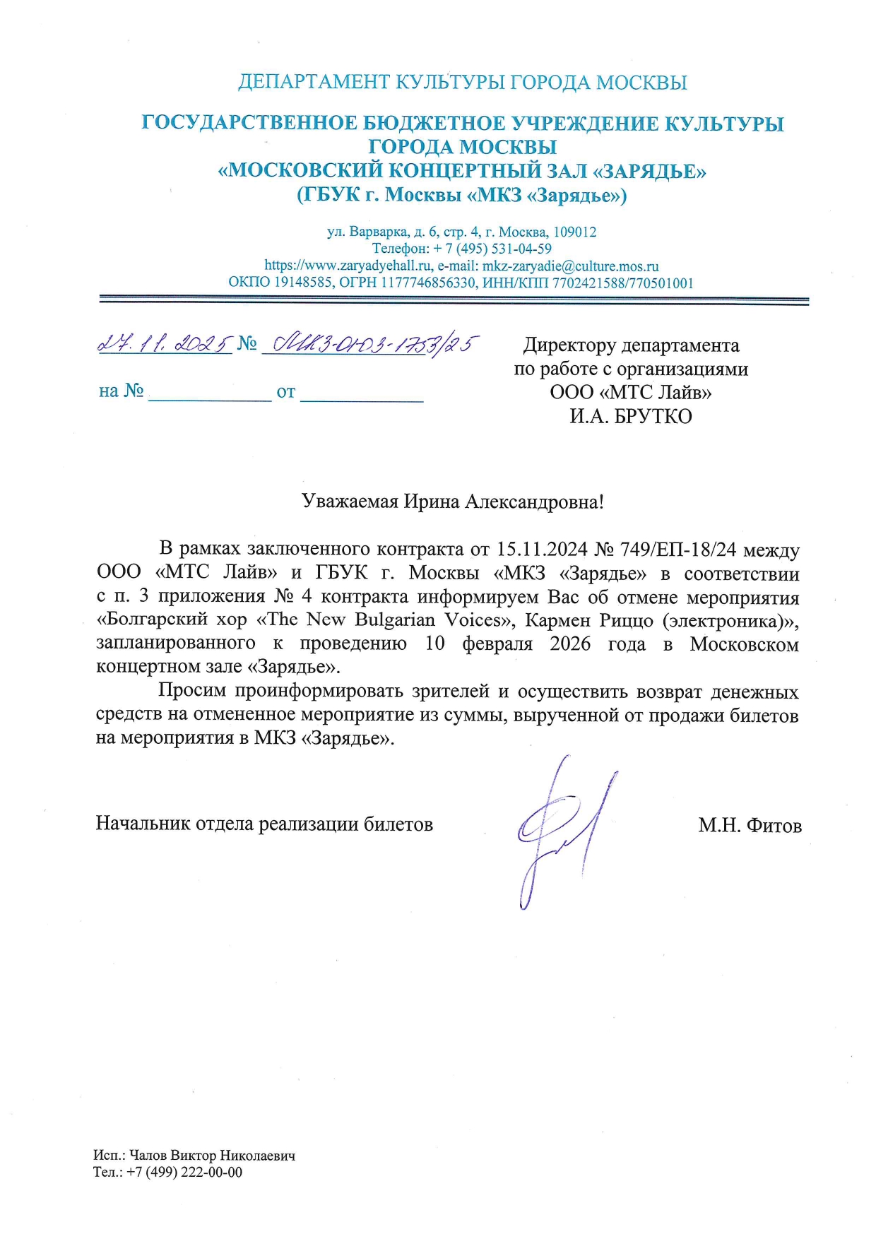 Уважаемый клиент! Спешим сообщить, что по информации, полученной от организатора, концерт «Мариам Мерабова. Латина в джазе», запланированный на 6 апреля 2025 года в 13:00 в Доме музыки, перенесен на 4 апреля 2026 года. Ранее приобретенные билеты действительны на новую дату, обменивать их не нужно. Если вам не удобно посетить мероприятие в новую дату, вы можете вернуть билет по кнопке в личном кабинете во вкладке «Заказы» (16 апреля 2025 г.). Деньги за электронные билеты вернутся автоматически в полном объёме на карту, с которой была произведена оплата. Если вы купили билет в кассе Ticketland.ru за наличный расчет, то обратитесь, пожалуйста, на почту: vozvrat@ticketland.ru. С уважением, команда поддержки Ticketland