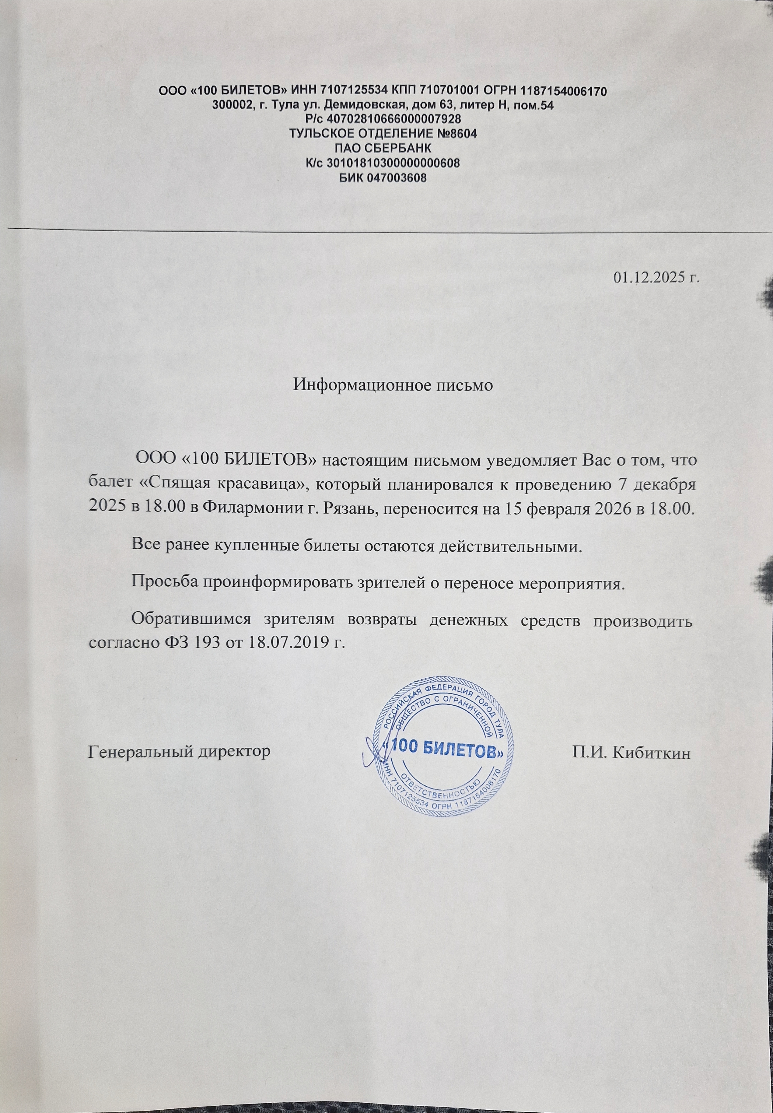 Уважаемый клиент! Спешим сообщить, что по информации, полученной от организатора, балет «Щелкунчик», запланированный на 10.12.2025 начало в 19:00 мин. в Дворец молодежи (г Екатеринбург), переносится на 26.12.2025 начало в 19:00 мин. в Дворец молодежи (г Екатеринбург). Ранее приобретенные билеты действительны, обменивать их не нужно. Если вам неудобно посетить мероприятие в новую дату, вы можете вернуть билет по кнопке в личном кабинете во вкладке «Заказы». Деньги за электронные билеты вернутся автоматически в полном объёме на карту, с которой была произведена оплата. Если вы купили билет в кассе Ticketland.ru за наличный расчет, то обратитесь, пожалуйста, на почту: vozvrat@ticketland.ru. С уважением, команда поддержки Ticketland.