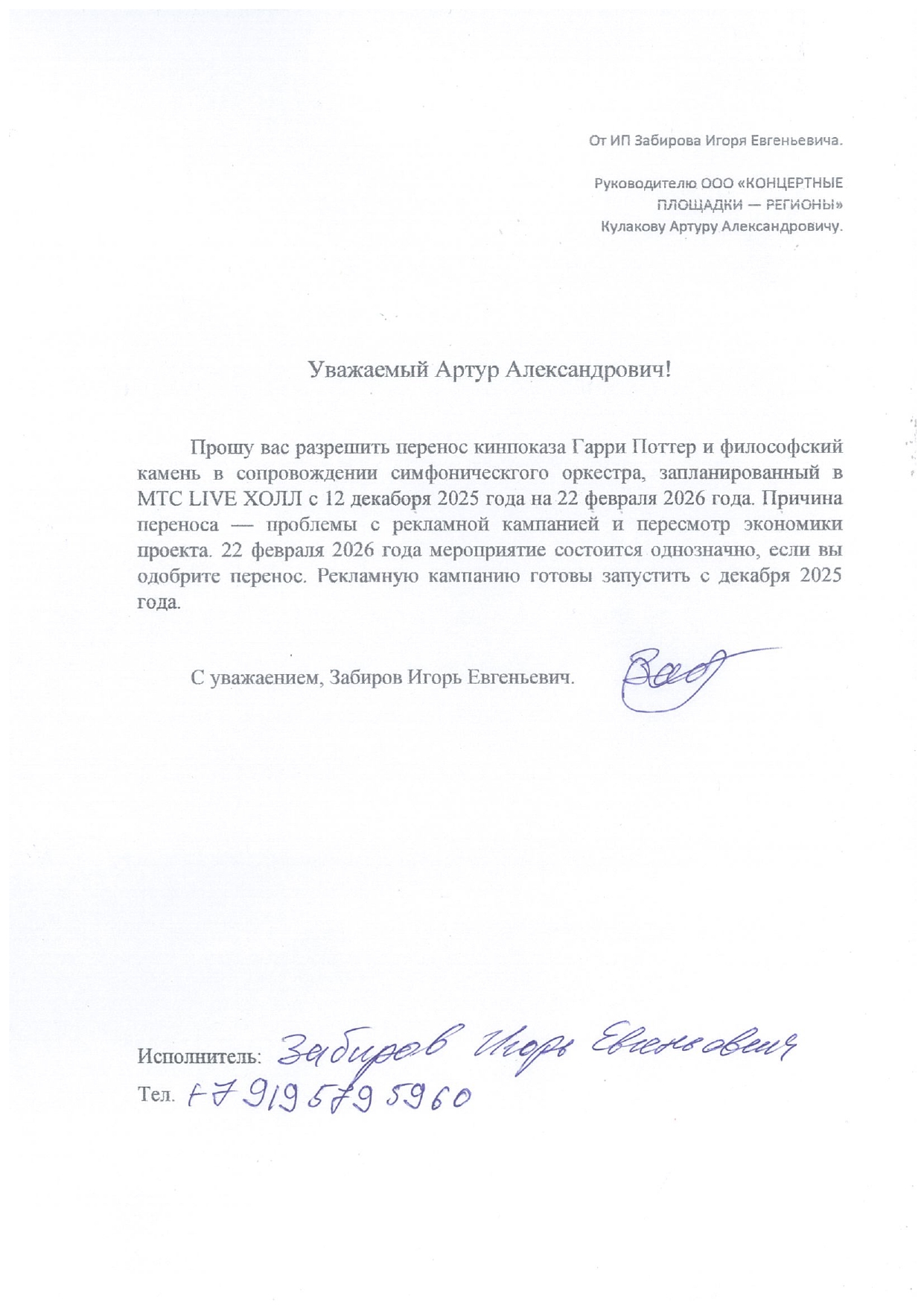 Уважаемый клиент! Спешим сообщить, что по информации, полученной от организатора, Кинопоказ «Гарри Поттер и философский камень» в сопровождении симфонического оркестра, запланированный на 12 декабря 2025 года в 19:00 в МТС Live Холл Челябинск, перенесён на 22 февраля 2026 года, начало в 19:00. Ранее приобретенные билеты действительны на новую дату, обменивать их не нужно. С уважением, команда поддержки Ticketland.
