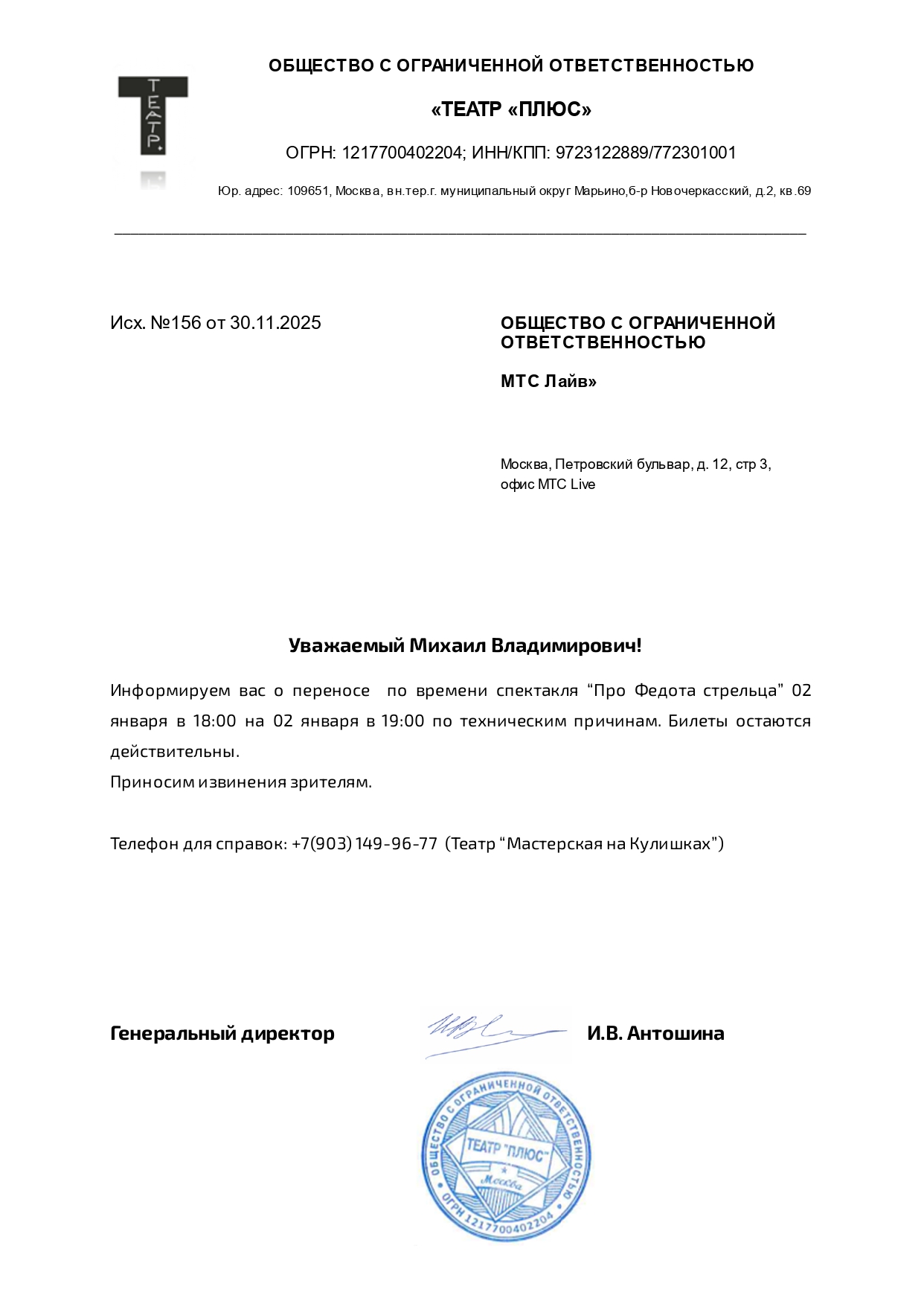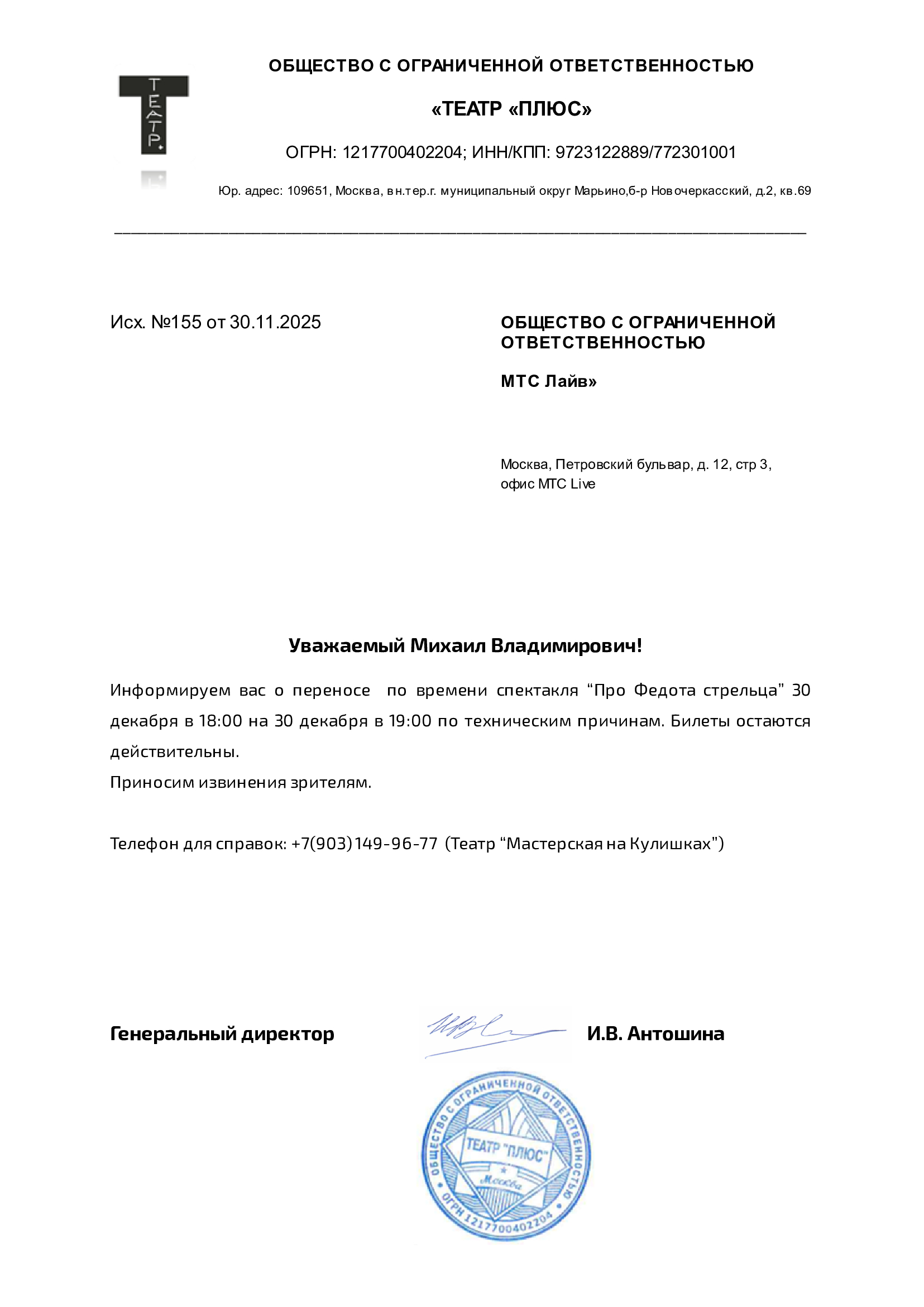 Уважаемый клиент! Спешим сообщить, что по информации, полученной от организатора, спектакль «Про Федота стрельца», запланированный на 2 января 2026 года в 18:00 в Мастерской на Кулишках, перенесён на один час вперёд. Верное время начала спектакля в 19:00. Ранее приобретенные билеты действительны на новое время, обменивать их не нужно. По всем вопросам обращайтесь, пожалуйста, к организатору спектакля по номеру телефона: +7 (903) 149-96-77 (Театр «Мастерская на Кулишках»). С уважением, команда поддержки Ticketland.
