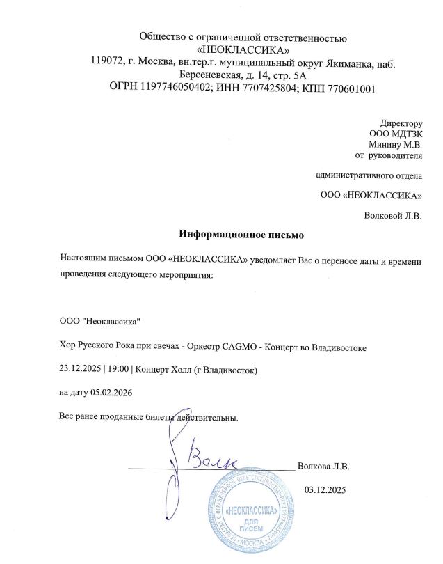 Уважаемый клиент! Спешим сообщить, что по информации, полученной от организатора, концерт «Хор Русского Рока при свечах - Оркестр CAGMO», запланированный на 23 декабря 2025 года в 19:00 в Концерт Холле (г. Владивосток), перенесен на 5 февраля 2026 года, начало в 19:00. Ранее приобретенные билеты действительны на новую дату, обменивать их не нужно. Если вам не удобно посетить мероприятие в новую дату, вы можете вернуть билет по кнопке в личном кабинете во вкладке «Заказы». Деньги за электронные билеты вернутся автоматически в полном объёме на карту, с которой была произведена оплата. Если вы купили билет в кассе Ticketland.ru за наличный расчет, то обратитесь, пожалуйста, на почту: vozvrat@ticketland.ru. С уважением, команда поддержки Ticketland