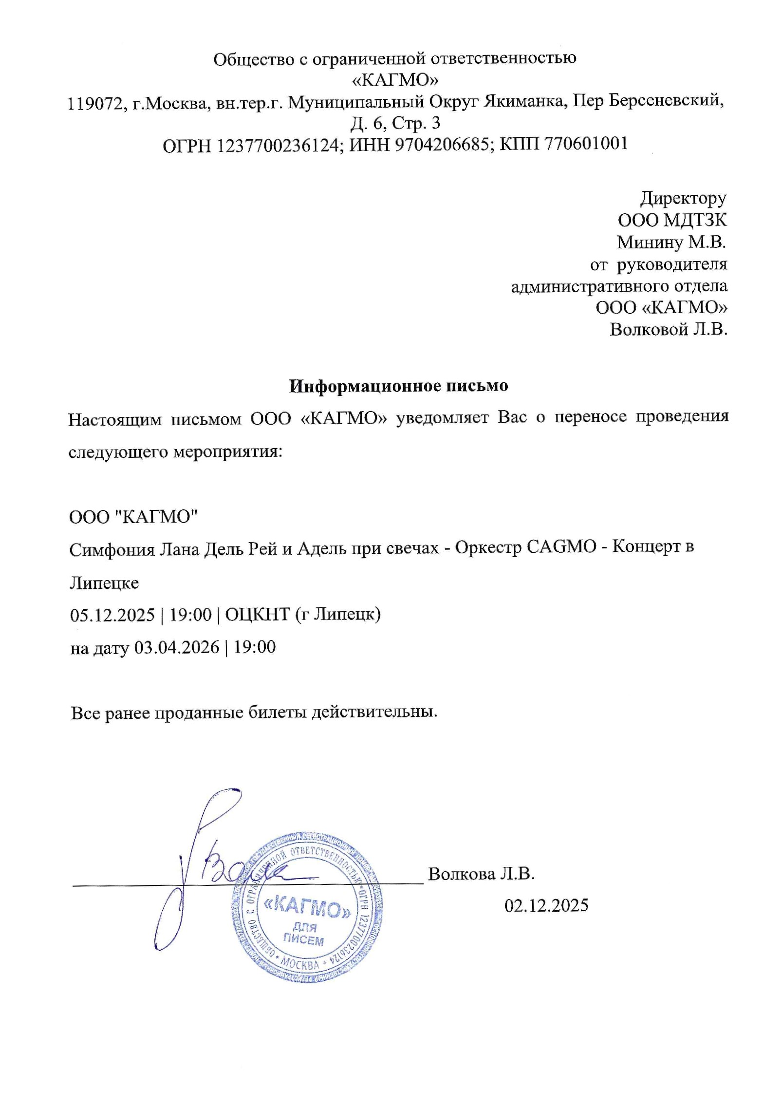Уважаемый клиент! Спешим сообщить, что по информации, полученной от организатора, концерт «Хор Русского Рока при свечах. Оркестр CAGMO», запланированный на 18 декабря 2025 года в 19:00 в ДК Машиностроитель (г. Петрозаводск), перенесен на 24 апреля 2026 года. Ранее приобретенные билеты действительны на новую дату, обменивать их не нужно. Если вам не удобно посетить мероприятие в новую дату, вы можете вернуть билет по кнопке в личном кабинете во вкладке «Заказы». Деньги за электронные билеты вернутся автоматически в полном объёме на карту, с которой была произведена оплата. Если вы купили билет в кассе Ticketland.ru за наличный расчет, то обратитесь, пожалуйста, на почту: vozvrat@ticketland.ru. С уважением, команда поддержки Ticketland.