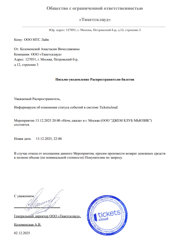 Уважаемый клиент! Спешим сообщить, что по информации, полученной от организатора, концерт «Ночь джаза», запланированный на 13.12.2025 в 20:00 вJam club, переносится на 13.12.2025 в 22:00 в Jam club. Ранее приобретенные билеты действительны, обменивать их не нужно. Если вам не удобно посетить мероприятие, вы можете вернуть билет по кнопке в личном кабинете во вкладке «Заказы». Деньги за электронные билеты вернутся автоматически в полном объёме на карту, с которой была произведена оплата. Если вы купили билет в кассе Ticketland.ru за наличный расчет, то обратитесь, пожалуйста, на почту: vozvrat@ticketland.ru. С уважением, команда поддержки Ticketland.
