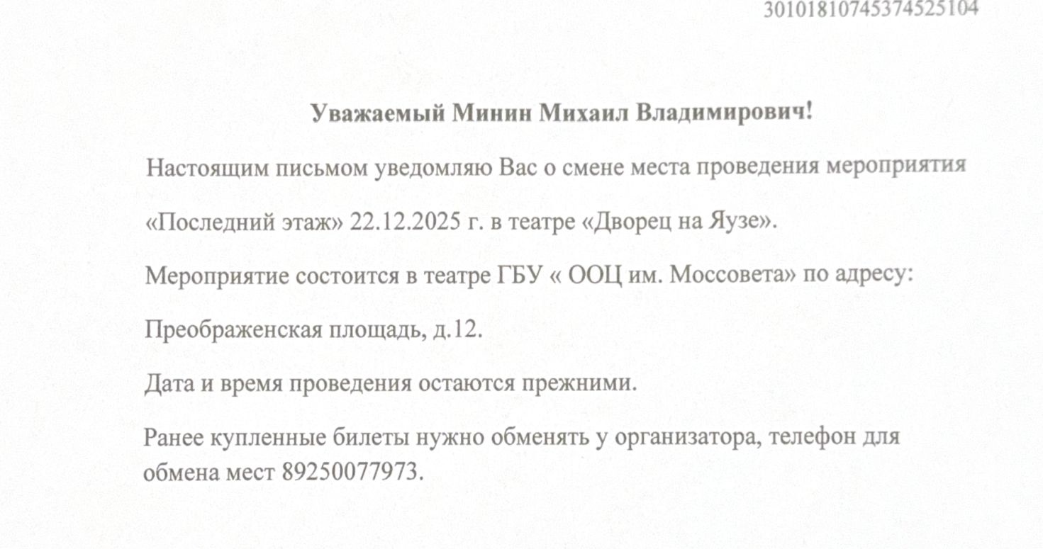 Уважаемый клиент! Спешим сообщить, что по информации, полученной от организатора, спектакль «Последний этаж», запланированный на 22 декабря 2025 года в 19:00 во Дворце на Яузе, перенесен в ГБУ ООЦ им. Моссовета, дата и время остаются неизменными. Ранее купленные билеты нужно обменять у организатора, телефон дляобмена мест: 89250077973 С уважением, команда поддержки Ticketland