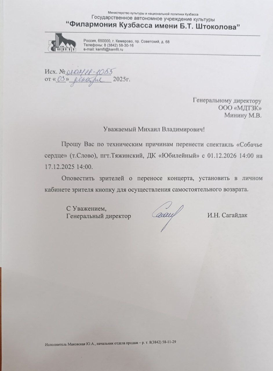 Уважаемый клиент! Спешим сообщить, что по информации, полученной от организатора, спектакль «Собачье сердце» (т. «Слово») запланированный на 1 декабря 2025 года в 14:00, в ДК «Юбилейный», перенесён на 17 декабря, начало в 14:00. Ранее приобретенные билеты действительны на новую дату, обменивать их не нужно. Если вам не удобно посетить мероприятие в новую дату, вы можете вернуть билет по кнопке в личном кабинете во вкладке «Заказы». Деньги за электронные билеты вернутся автоматически в полном объёме на карту, с которой была произведена оплата. Если вы купили билет в кассе Ticketland.ru за наличный расчет, то обратитесь, пожалуйста, на почту: vozvrat@ticketland.ru. С уважением, команда поддержки Ticketland