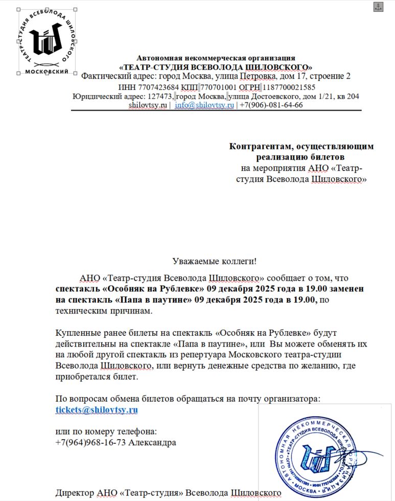 Уважаемый клиент! Спешим сообщить, что по информации, полученной от организатора, спектакль «Особняк на Рублевке», запланированный на 9 декабря 2025 года в 19:00 в театре-студии Всеволода Шиловского, заменён на спектакль «Папа в паутине». Ранее приобретенные билеты действительны, обменивать их не нужно. Если вам не удобно посетить мероприятие, вы можете вернуть билет по кнопке в личном кабинете во вкладке «Заказы». Деньги за электронные билеты вернутся автоматически в полном объёме на карту, с которой была произведена оплата. Если вы купили билет в кассе Ticketland.ru за наличный расчет, то обратитесь, пожалуйста, на почту: vozvrat@ticketland.ru. С уважением, команда поддержки Ticketland