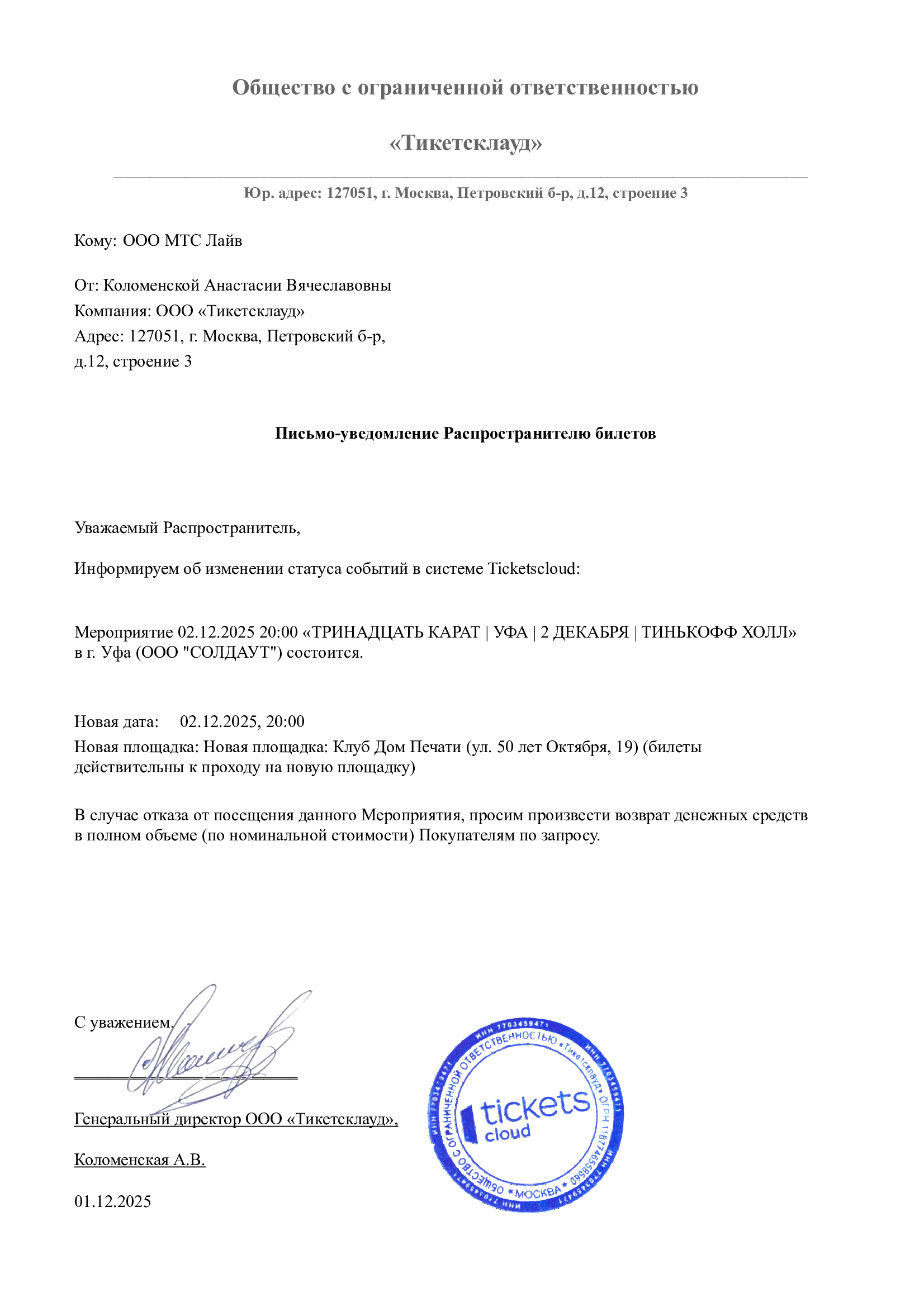Уважаемый клиент! Спешим сообщить, что по информации, полученной от организатора, концерт «АК-47», запланированный на 27 апреля 2025 в 19:00 в клубе «Галактика», перенесён на 27 декабря 2025 г., начало в 19:00, на новую площадку: Конгресс-холл Центра Международной торговли (проспект Ленина, 35). Так же состоится совместный концерт АК-47 и TGK. Ранее приобретенные билеты действительны на новую дату. Все билеты на танцпол действительны, обменивать не нужно. Для обмена VIP мест будет сделана отдельная рассылка на почты, указанные при покупке билетов. Если вам не удобно посетить мероприятие в новую дату, вы можете вернуть билет по кнопке в личном кабинете во вкладке «Заказы». Деньги за электронные билеты вернутся автоматически в полном объёме на карту, с которой была произведена оплата. Если вы купили билет в кассе Ticketland.ru за наличный расчет, то обратитесь, пожалуйста, на почту: vozvrat@ticketland.ru. С уважением, команда поддержки Ticketland