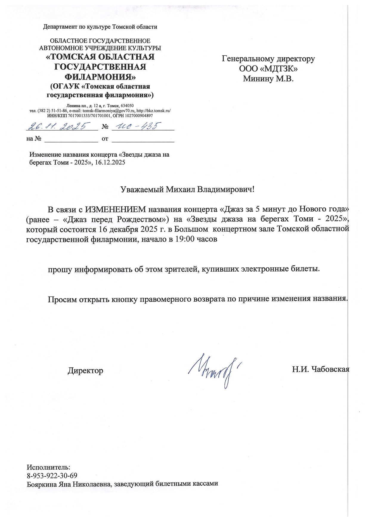Уважаемый клиент! Спешим сообщить, что по информации, полученной от организатора, концерт «Джаз за 5 минут до Нового года» запланированный на 16 декабря 2025 года в 19:00 в Томской филармонии, заменен на концерт «Звезды джаза на берегах Томи — 2025». Ранее приобретенные билеты действительны, обменивать их не нужно. Если вы не хотите посетить новое мероприятие, вернуть билет можно по кнопке в личном кабинете во вкладке «Заказы». Деньги за электронные билеты вернутся автоматически в полном объёме на карту, с которой была произведена оплата. Если вы купили билет в кассе Ticketland.ru за наличный расчет, то обратитесь, пожалуйста, на почту: vozvrat@ticketland.ru. С уважением, команда поддержки Ticketland