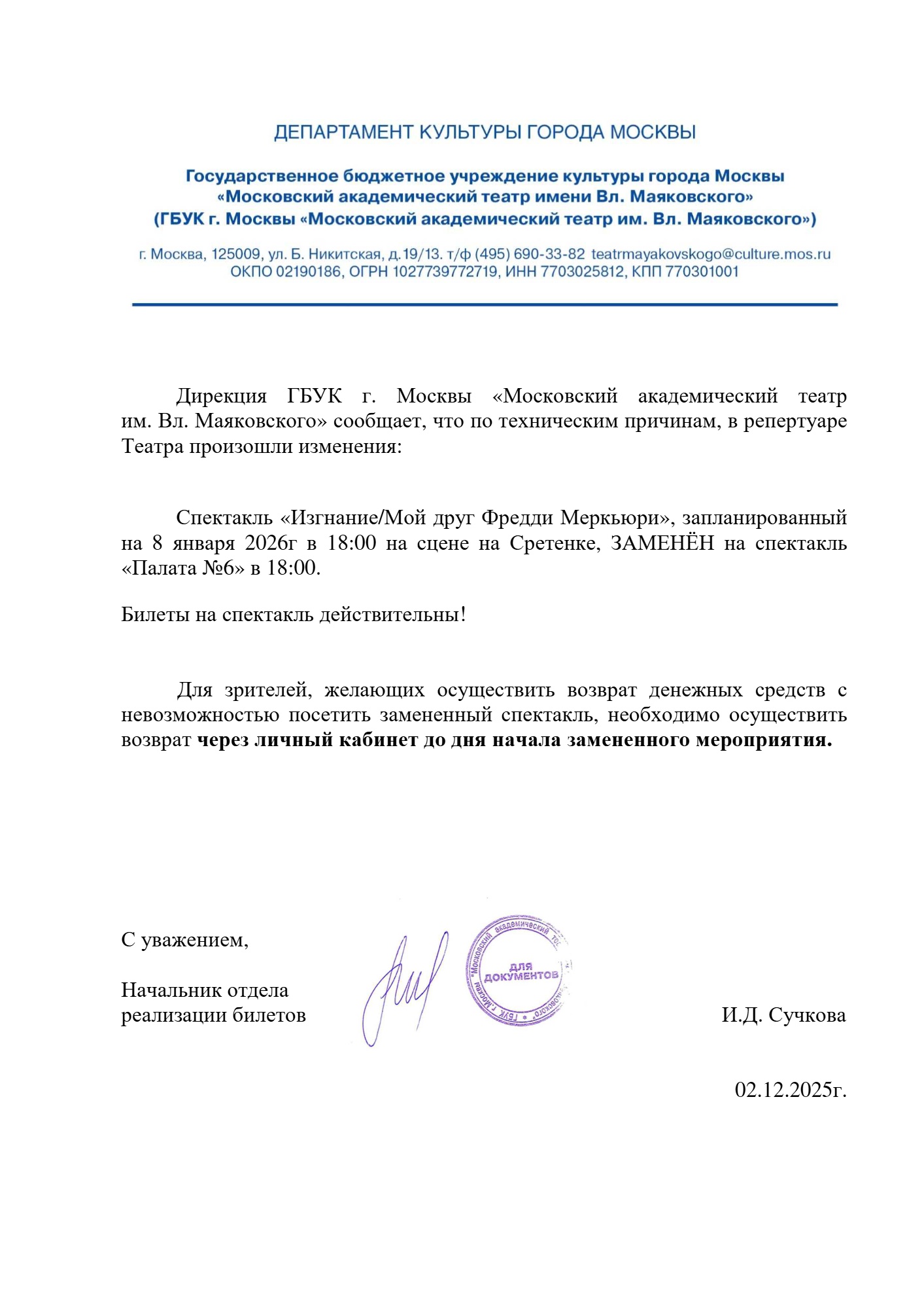 Уважаемый клиент! Спешим сообщить, что по информации, полученной от организатора, спектакль «Кроткая», запланированный на 04 декабря 2025 года в 19:00 в Малом театре, заменён на спектакль «На всякого мудреца довольно простоты». Ранее приобретенные билеты действительны, обменивать их не нужно. Если вы не хотите посетить новое мероприятие, вы можете вернуть билет по кнопке в личном кабинете во вкладке «Заказы». Деньги за электронные билеты вернутся автоматически в полном объёме на карту, с которой была произведена оплата. Если вы купили билет в кассе Ticketland.ru за наличный расчет, то обратитесь, пожалуйста, на почту: vozvrat@ticketland.ru. С уважением, команда поддержки Ticketland.