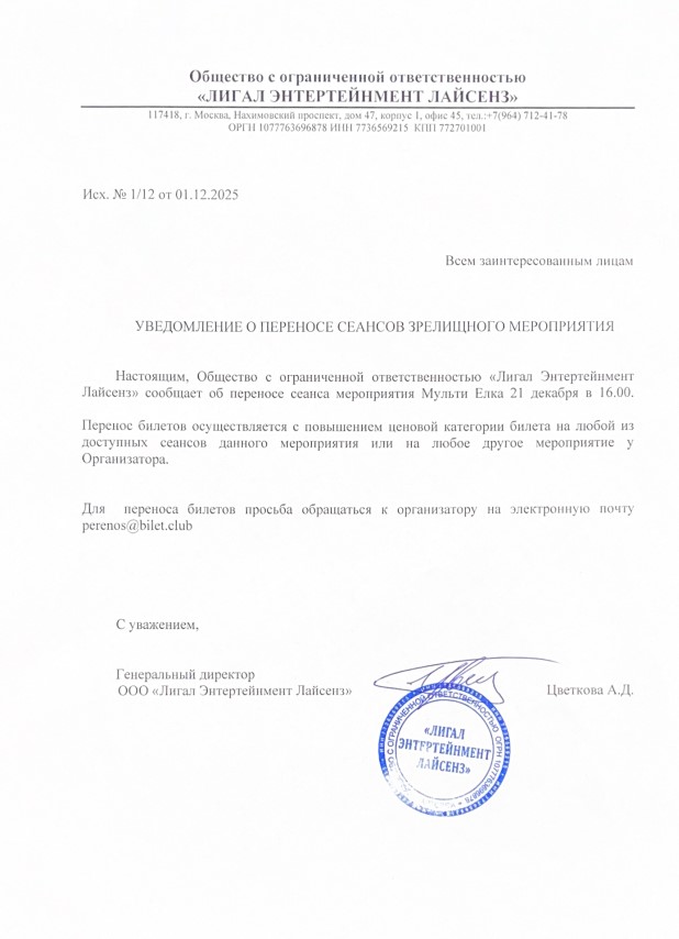 Уважаемый клиент! Спешим сообщить, что по информации, полученной от организатора, спектакль «Мульти Ёлка», запланированный на 21 декабря 2025 года в 16:00 в ЦК «Щукино», перенесен. Организатор предлагает перенос билетов на любое другое мероприятие с повышениемценовой категории билетов. По всем вопросам, пожалуйста, обращайтесь к организатору мероприятия по электронной почте perenos@bilet.club. С уважением, команда поддержки Ticketland