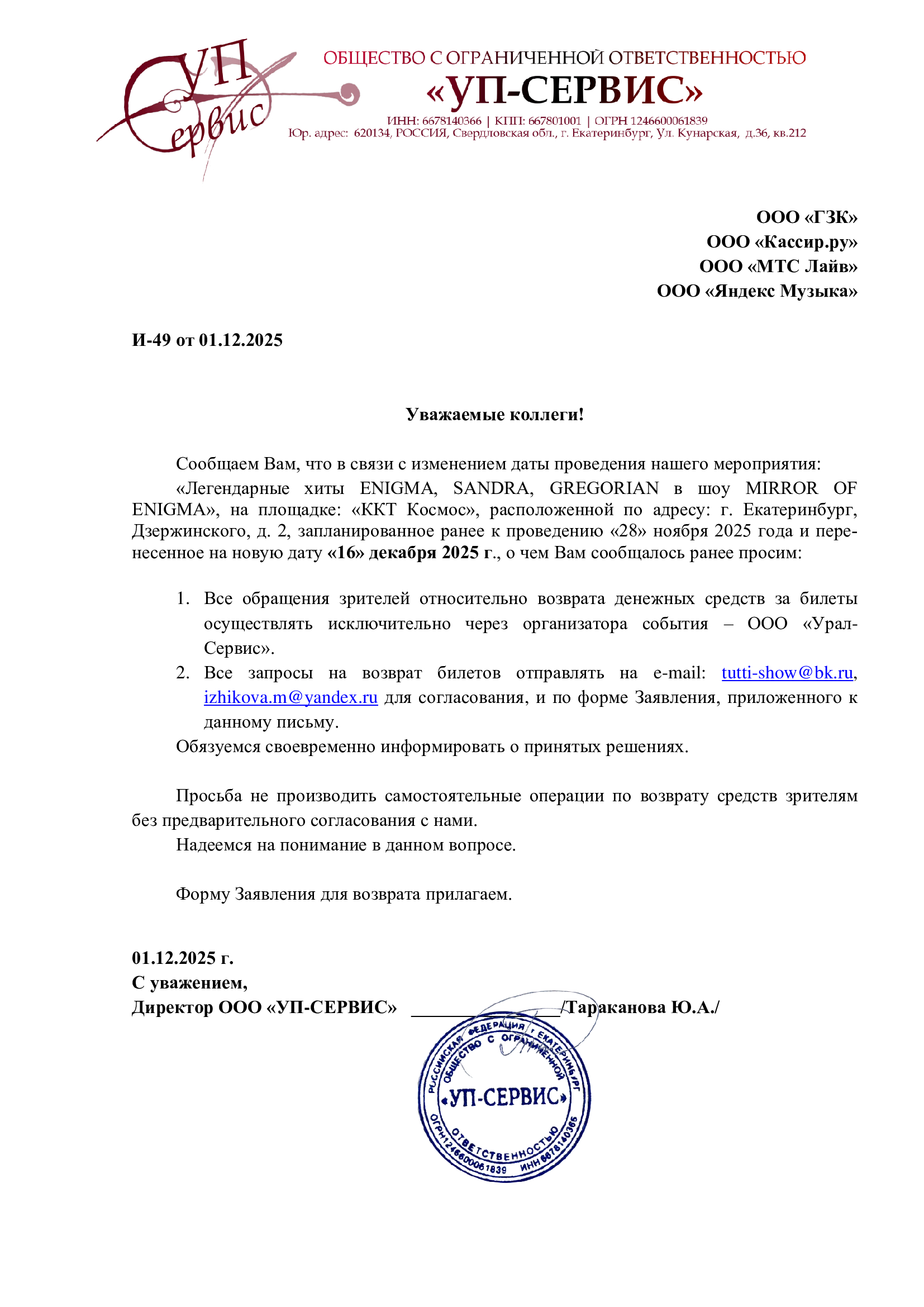 Уважаемый клиент! Спешим сообщить, что по информации, полученной от организатора, шоу «Mirror of Enigma» «Легендарные хиты Enigma, Sandra, Gregorian», запланированное на 28 ноября 2025 года в 19:00 в ККТ «Космос», перенесено на 16 декабря 2025 года, начало в 19:00. Ранее приобретенные билеты действительны на новую дату, обменивать их не нужно. По вопросам возвратов обращайтесь, пожалуйста, к организатору шоу по электронной почте: tutti-show@bk.ru и izhikova.m@yandex.ru. Форма заявления для возврата (лист 1) и Форма заявления для возврата (лист 2) С уважением, команда поддержки Ticketland.