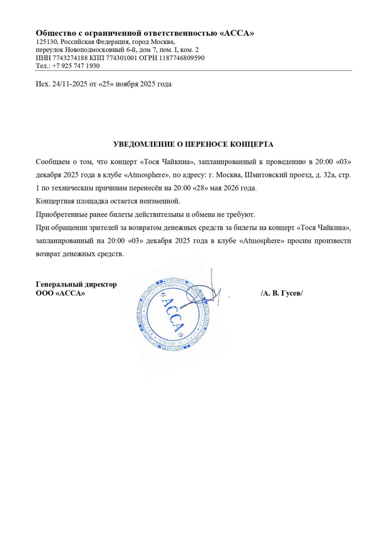 Уважаемый клиент! Спешим сообщить, что по информации, полученной от организатора, концерт Тоси Чайкиной запланированный на 3 декабря 2025 года в 20:00, в клубе «Atmosphere Moscow» перенесено на 28 мая 2026 года начало в 20:00 Ранее приобретенные билеты действительны на новую дату, обменивать их не нужно. Если вам не удобно посетить мероприятие в новую дату, вы можете вернуть билет по кнопке в личном кабинете во вкладке «Заказы». Деньги за электронные билеты вернутся автоматически в полном объёме на карту, с которой была произведена оплата. Если вы купили билет в кассе Ticketland.ru за наличный расчет, то обратитесь, пожалуйста, на почту: vozvrat@ticketland.ru. С уважением, команда поддержки Ticketland