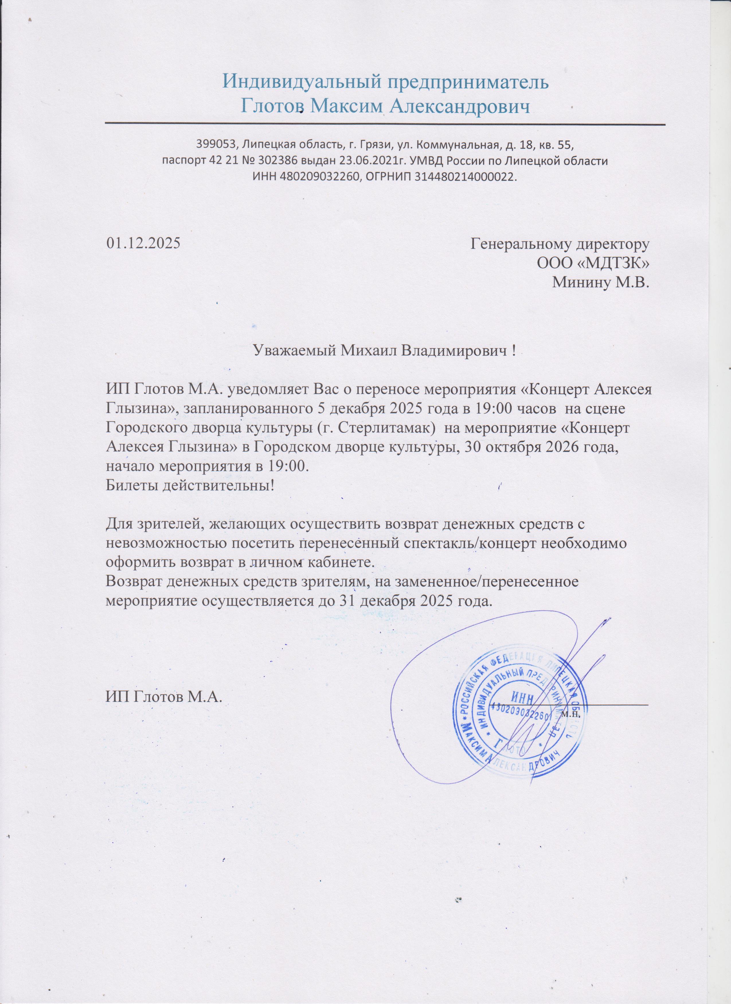 Уважаемый клиент! Спешим сообщить, что по информации, полученной от организатора, концерт Алексея Глызина, запланированный на 24 апреля 2025 года в 19:00 в КРК Пирамида, перенесен на 18 декабря 2025 г., начало в 19:00. Ранее приобретенные билеты действительны на новую дату, обменивать их не нужно. Если вам не удобно посетить мероприятие в новую дату, вы можете вернуть билет по кнопке в личном кабинете во вкладке «Заказы» (до 30 мая 2025 г.). Деньги за электронные билеты вернутся автоматически в полном объёме на карту, с которой была произведена оплата. Если вы купили билет в кассе Ticketland.ru за наличный расчет, то обратитесь, пожалуйста, на почту: vozvrat@ticketland.ru. С уважением, команда поддержки Ticketland