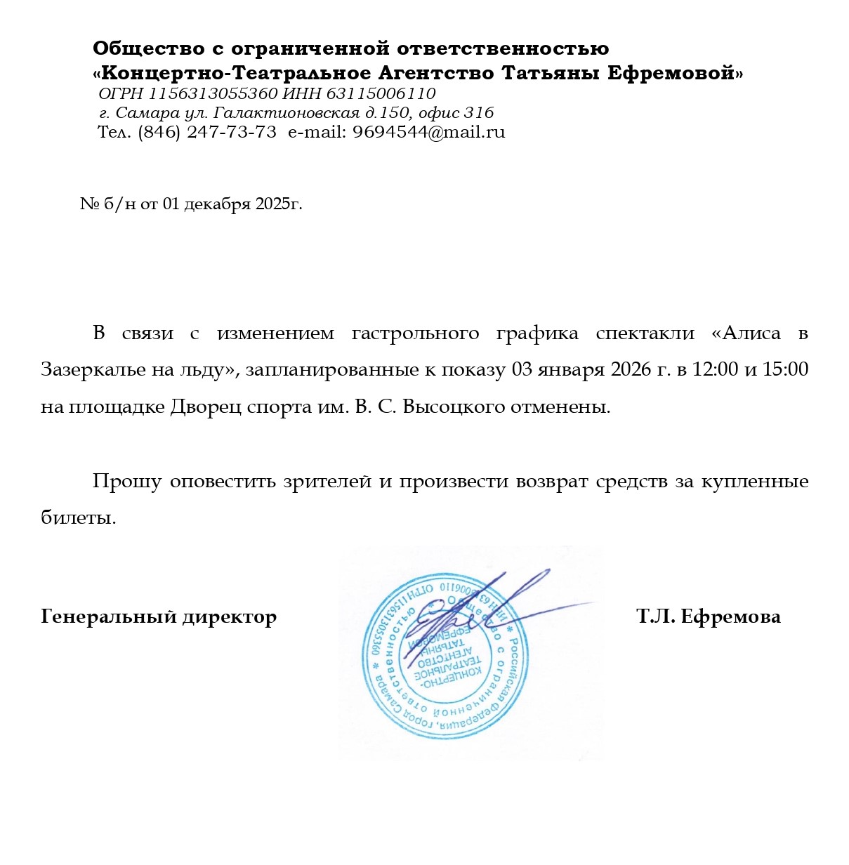 Уважаемый клиент! Спешим сообщить, что по информации, полученной от организатора, спектакль «Алиса в Зазеркалье на льду», запланированный на 3 января 2026 года в 12:00 и в 15:00 в СКК «Дворец Спорта имени Владимира Высоцкого», отменён. Деньги за электронные билеты вернутся автоматически в полном объёме на карту, с которой была произведена оплата. Если вы купили билет в кассе Ticketland.ru за наличный расчет, то обратитесь, пожалуйста, на почту: vozvrat@ticketland.ru. С уважением, команда поддержки Ticketland.